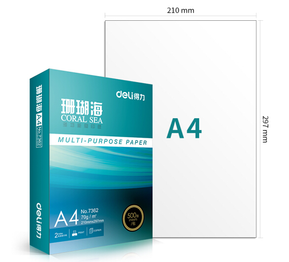 • 商品名称:得力(deli)珊瑚海 70g A4 复印纸 中档款打印纸 500张/包 10包1箱(整箱5000张)